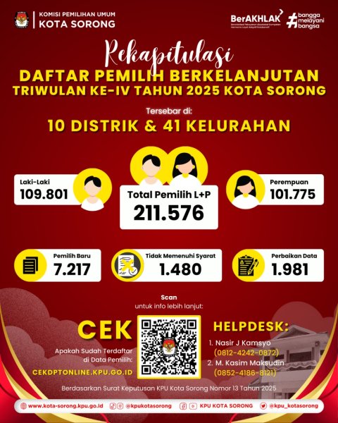 PENGUMUMAN PENETAPAN REKAPITULASI PEMUTAKHIRAN DATA PEMILIH BERKELANJUTAN KOTA SORONG PROVINSI PAPUA BARAT DAYA TRIWULAN IV TAHUN 2025
