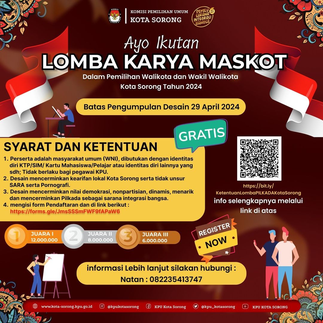 Untuk pengumuman lebih Lengkap dapat dilihat melalui Link https://bit.ly/KetentuanLombaPILKADAKotaSorong