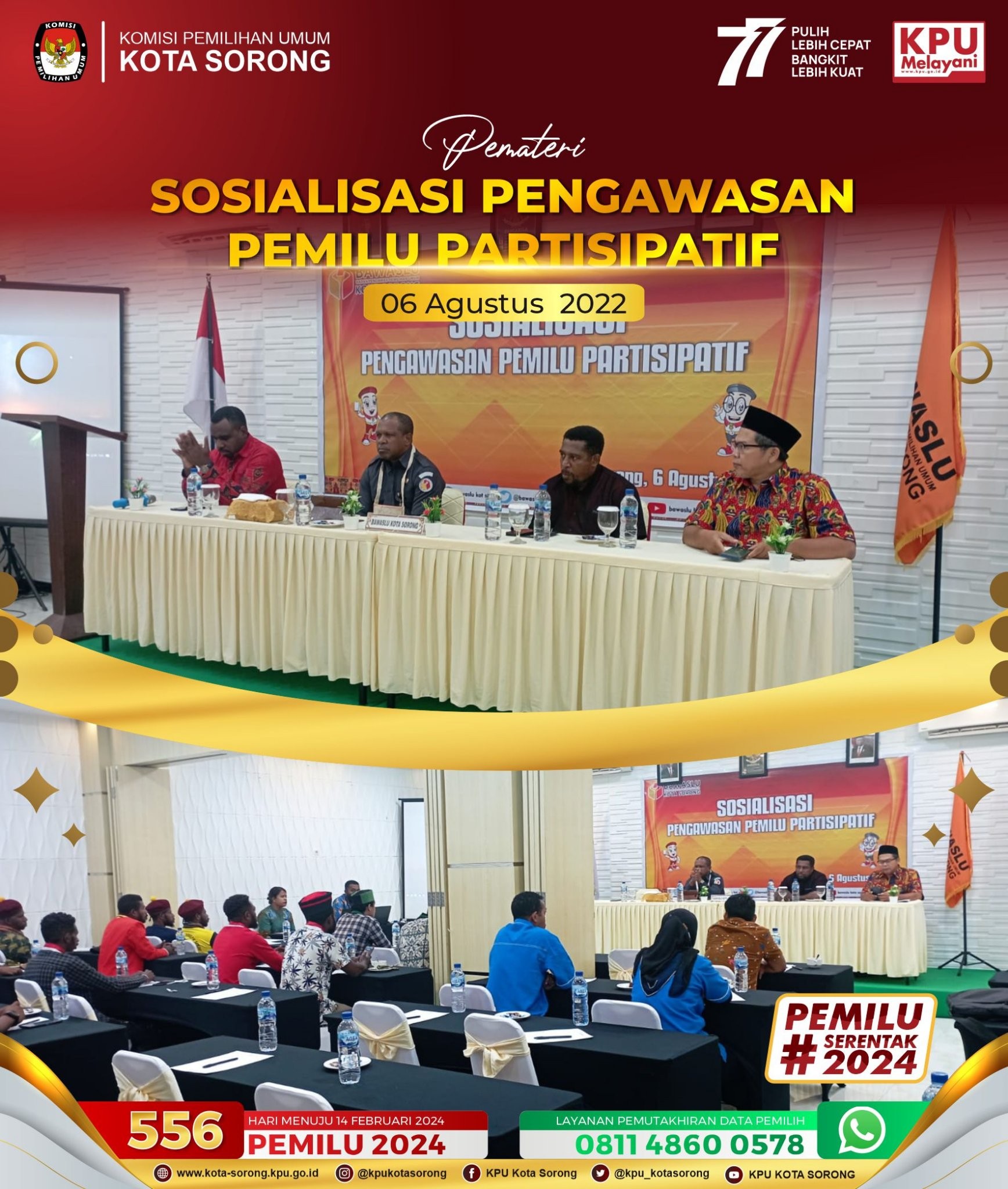 Kota Sorong - kota-sorong.kpu.go.id, Ketua KPU Kota Sorong, Roberth B. Yumame dan Anggota KPU Provinsi Papua Barat Divisi Sosialisasi, Pendidikan Pemilih, Partisipasi Masyarakat dan SDM, Abdul Halim Shidiq menjadi pemateri dalam kegiatan Sosialisasi Pengawasan Pemilu Partisipatif yang di lakukan oleh Badan Pengawas Pemilihan Umum (Bawaslu) Kota Sorong