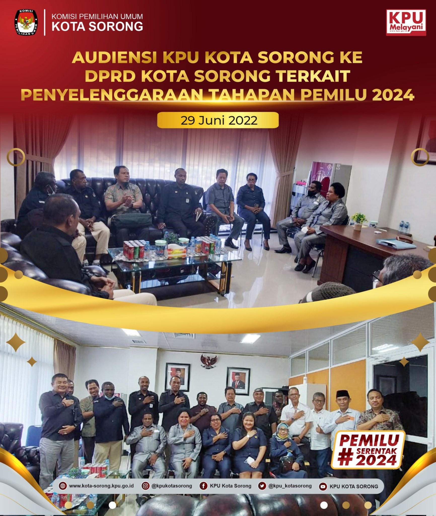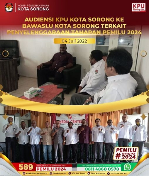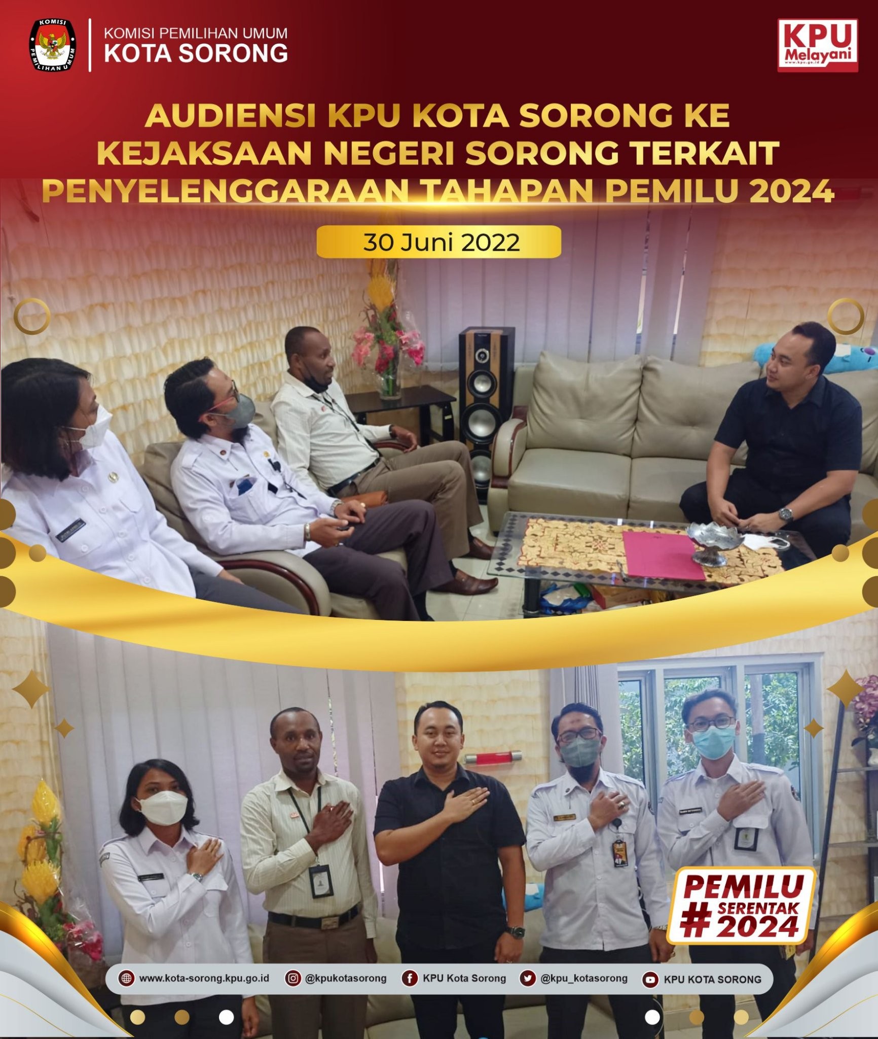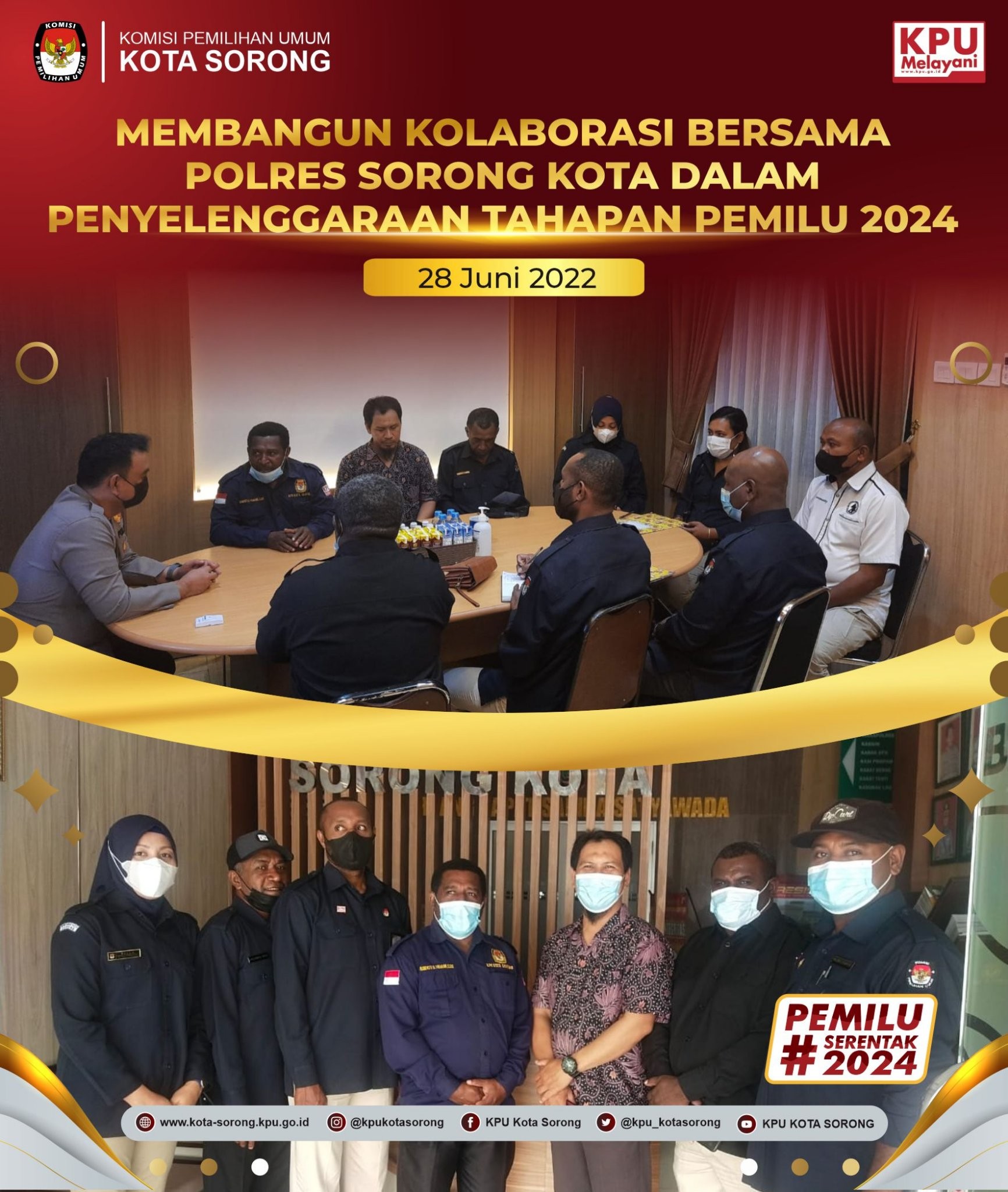 Kota Sorong - kota-sorong.kpu.go.id, Pelaksanaan kunjungan KPU Kota Sorong yaang dalam hal ini dihadiri oleh Ketua, Anggota, Sekretaris dan Para staff Sekretariat KPU Kota Sorong dalam Rangka Menindaklanjutin Kegiatan Sosialisasi PKPU Nomor 3 Tahun 2022 Tentang Tahapan dan Jadwal Penyelenggaraan Pemilu 2024 yang bertempat di Polres Sorong Kota. Kunjungan Kerja dilaksanakan pada Hari Selasa, 28 Juni 2022 Pukul 10:58 – 11:16 WIT yang berlangsung di Ruang Kerja Kapolres Sorong Kota diawali dengan Ketua memperkenalkan Seluruh Anggota, Sekretaris dan para Staff KPU Kota Sorong dilanjutkan dengan Penyampaian PKPU Nomor 3 Tahun 2022, dalam pembahasan tersebut Bapak Ketua KPU Kota Sorong mengharapkan dukungan sepenuhnya dari pihak pengamanan dalam proses Tahapan yang telah berlangsung, tetap saling berkomunikasi dan KPU Kota Sorong akan sesering mungkin melakukan kunjungan kerja ke Polres Sorong Kota.