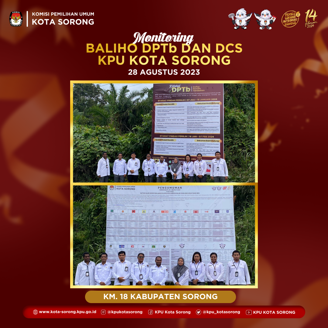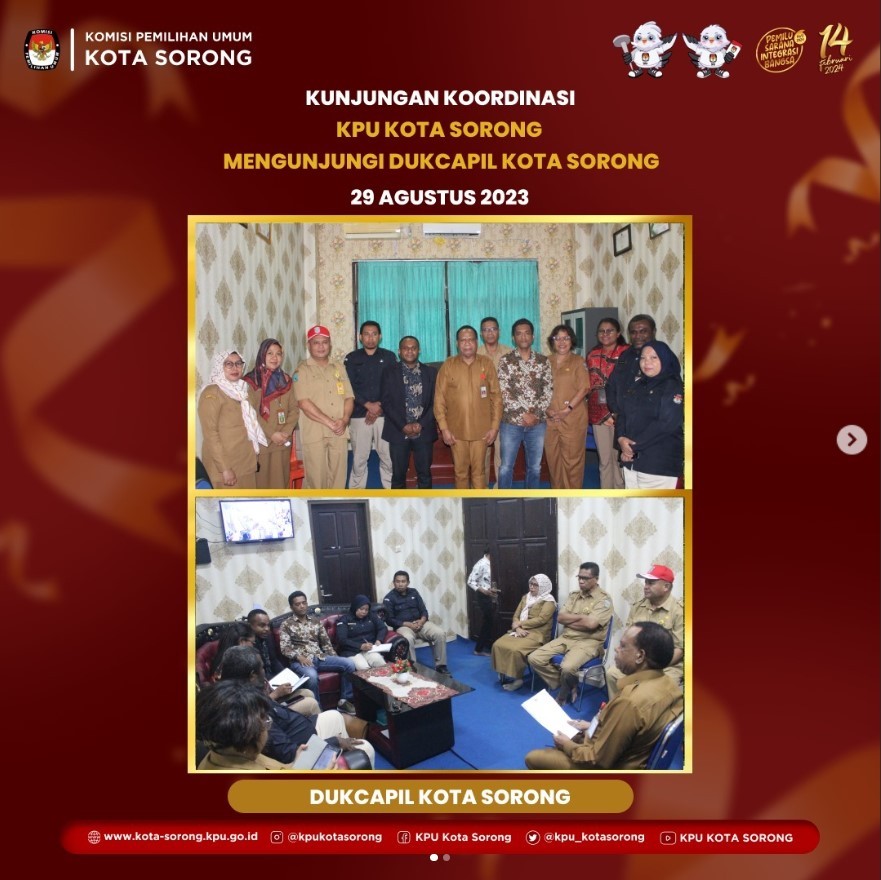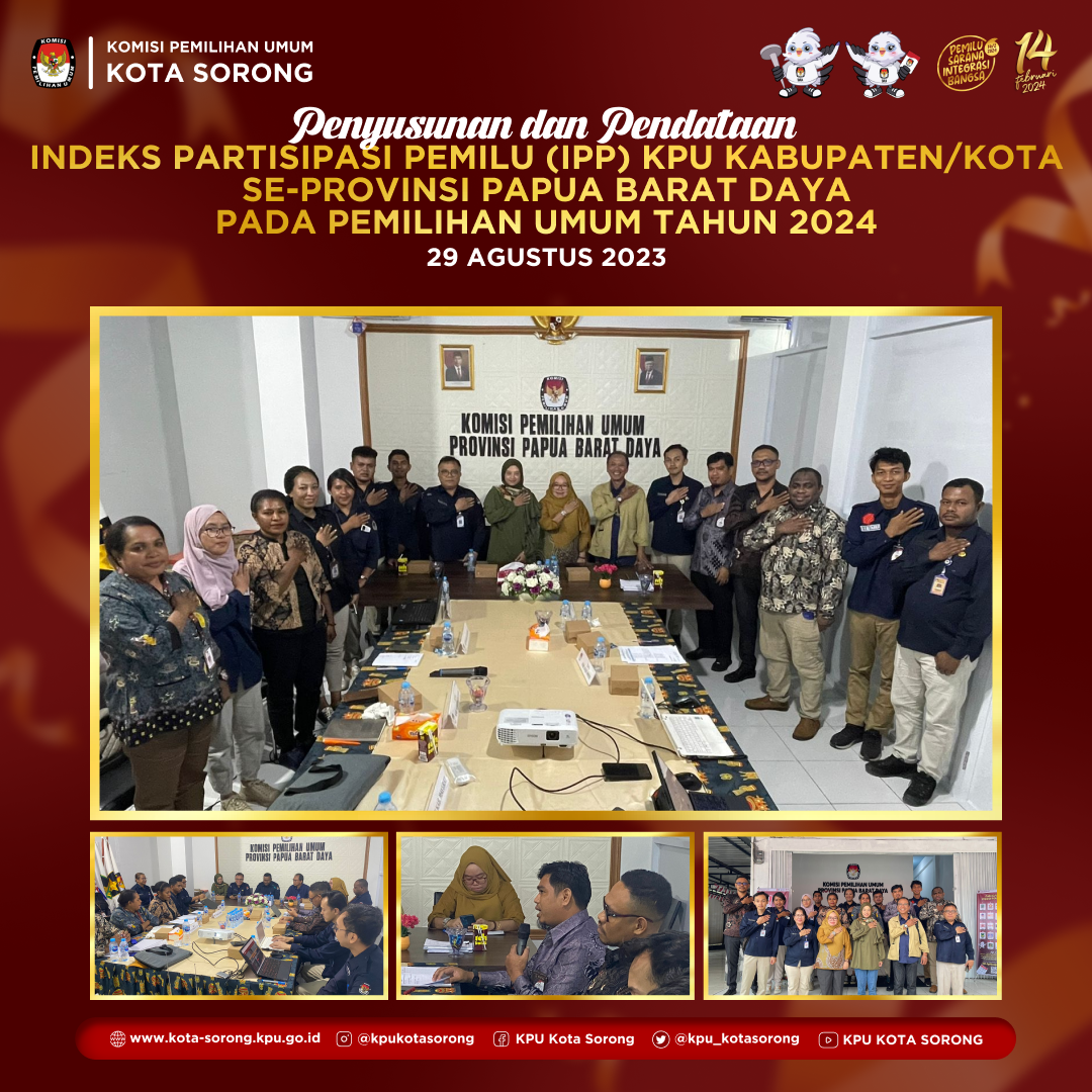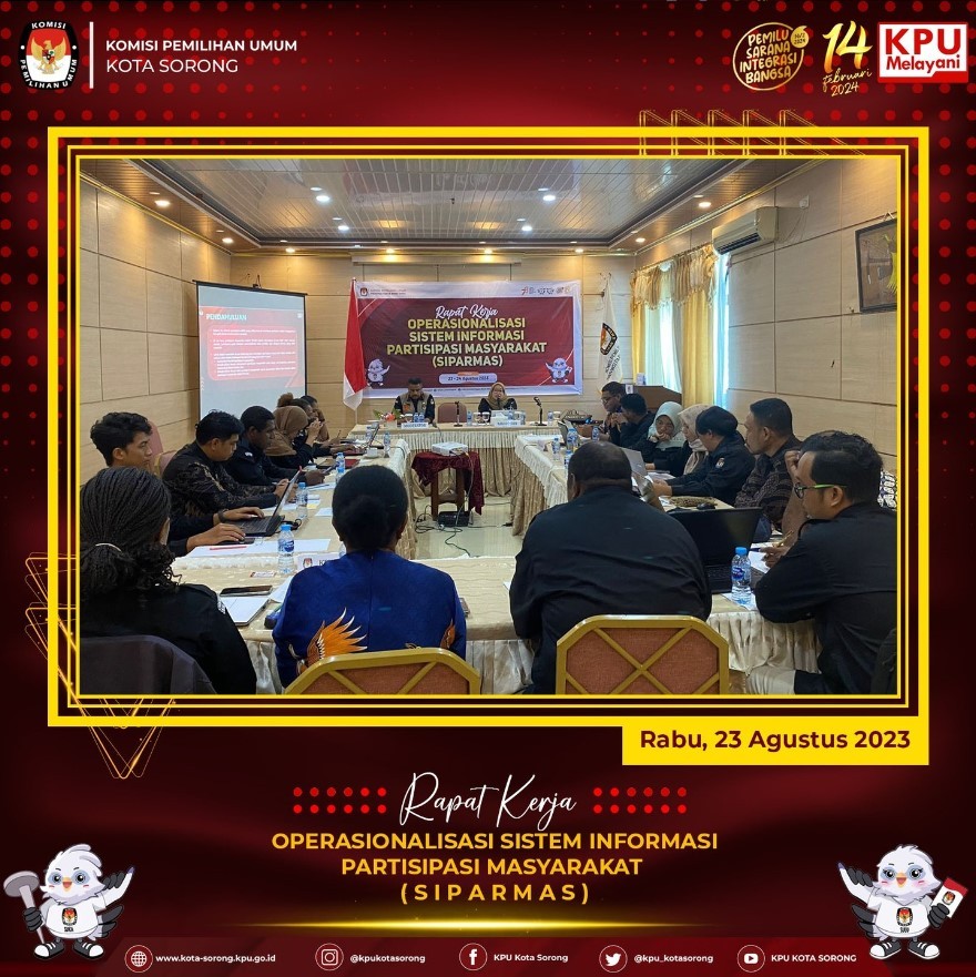 ta Sorong tanggal 23 - 24 Agustus 2024, KPU Kota Sorong menghadiri Rapat Kerja Operasionalisasi Sistem Informasi Partisipasi Masyarakat (SIPARMAS) yang diselenggarakan oleh KPU Provinsi Papua Barat Daya dihadiri oleh Kadiv Sosdiklih, Parmas, & SDM, Kasubag Teknis, & admin SIPARMAS Kab/Kota se Provinsi Papua Barat Daya.