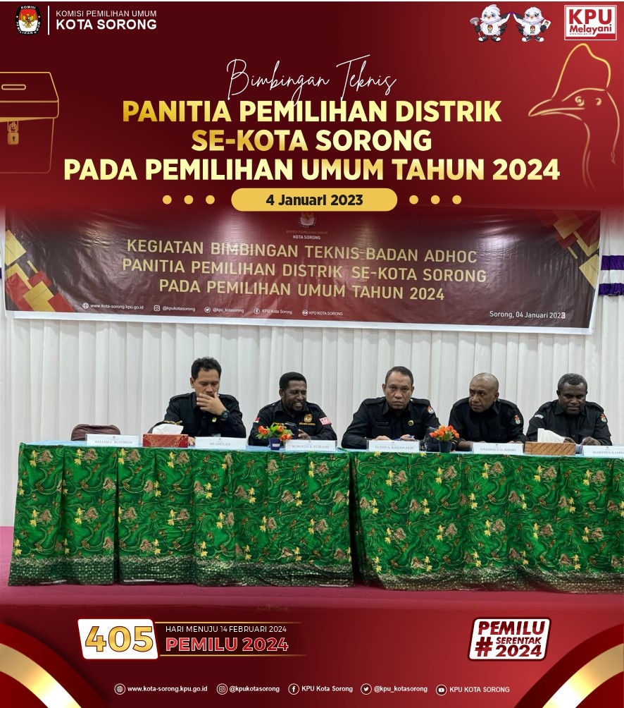 Kota Sorong - kota-sorong.kpu.go.id, Selepas Acara Pelantikan Panitia Pemlihan Distrik Se-Kota Sorong pada tanggal 4 Januari 2023. ,Komisi Pemilihan Umum Kota Sorong melaksanakan Bimbingan Teknis kepada Panitia Pemilihan Distrik se-Kota Sorong, Dengan Tujuan Agar Memantapkan PPD Se-Kota Sorong dalam Pemahaman Terhadap Regulasi dan Tahapan Pemilu Yang Saling Beririsan dan Padat, Selain Itu Juga Materi Yang disampaikan Pemateri Bertujuan Untuk Membangun Rasa Loyalitas dan Kekompakan Untuk Panitia Pemilihan Distrik Se-Kota Sorong.